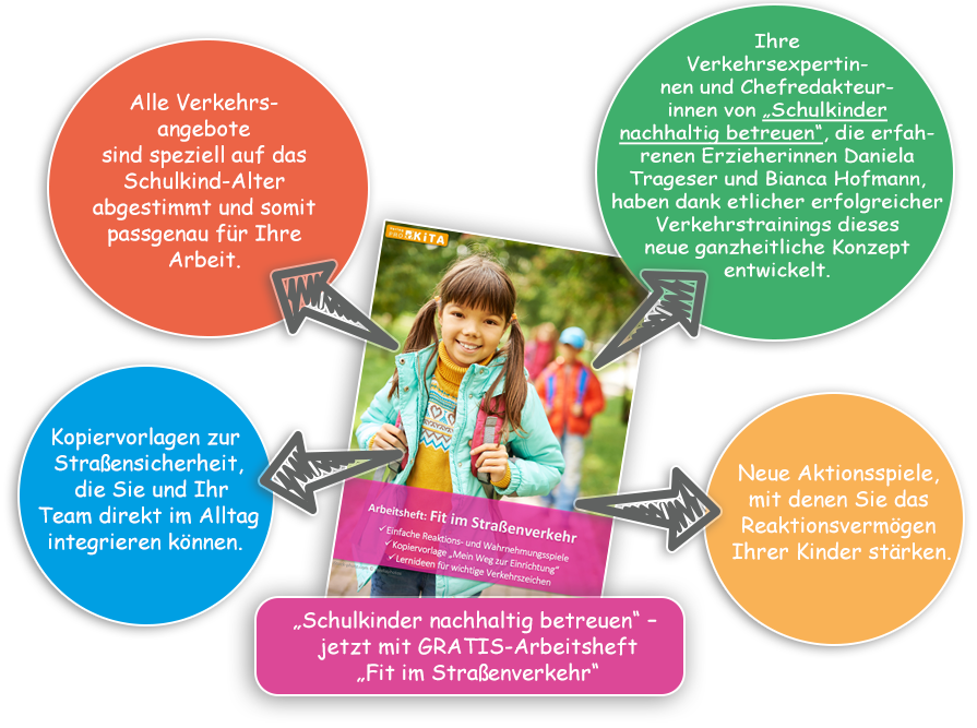 Klicken Sie hier, um Ihr Gratis-Arbeitsheft „Fit im Straßenverkehr“ und Ihre Gratis-Ausgabe „Schulkinder nachhaltig betreuen“ umgehend zu erhalten und selbst testen zu können. Freuen Sie sich auf spannende und immer wieder neue Ideen!