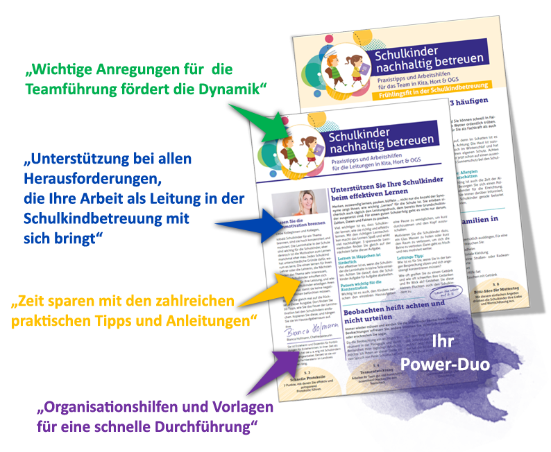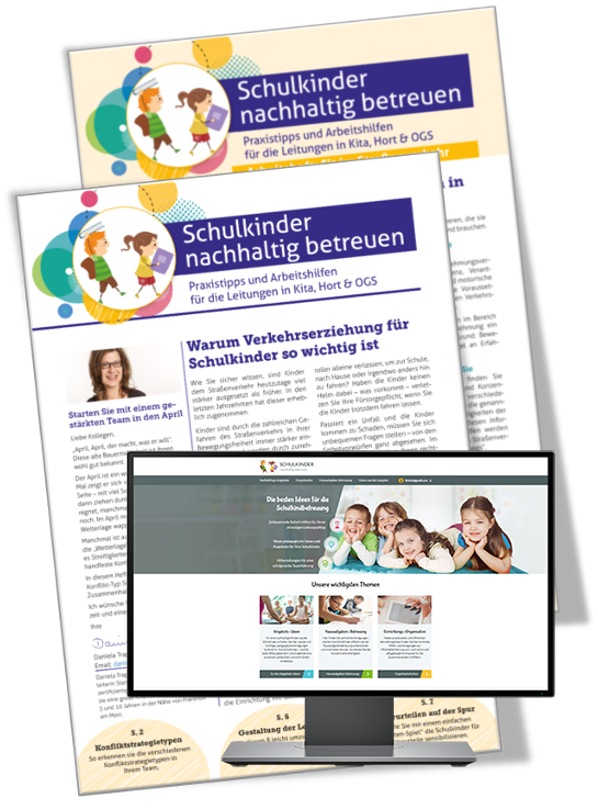 Mit „Schulkinder nachhaltig betreuen“ erhalten Sie als Leitung jeden Monat nicht nur für die pädagogische Arbeit eine Ausgabe speziell für Sie. Sie erhalten hier Tipps und Hilfen für Ihre Organisation, um ohne viel Aufwand Ihren Bildungsauftrag erfolgreich zu erfüllen.